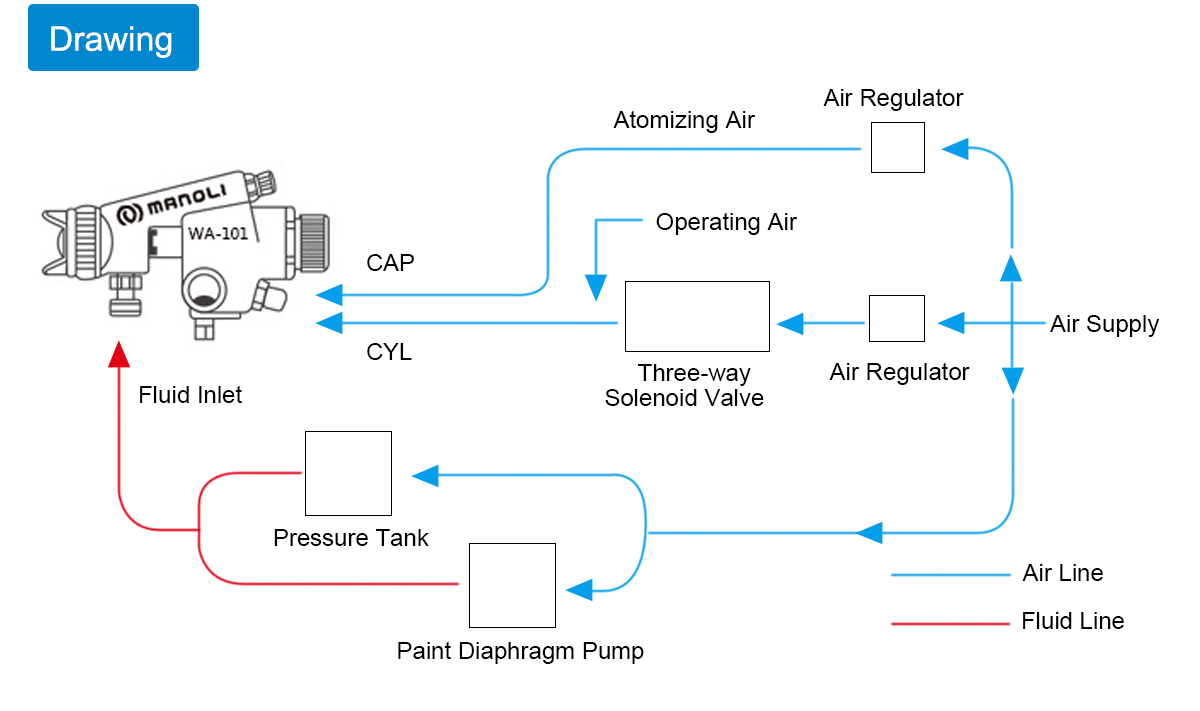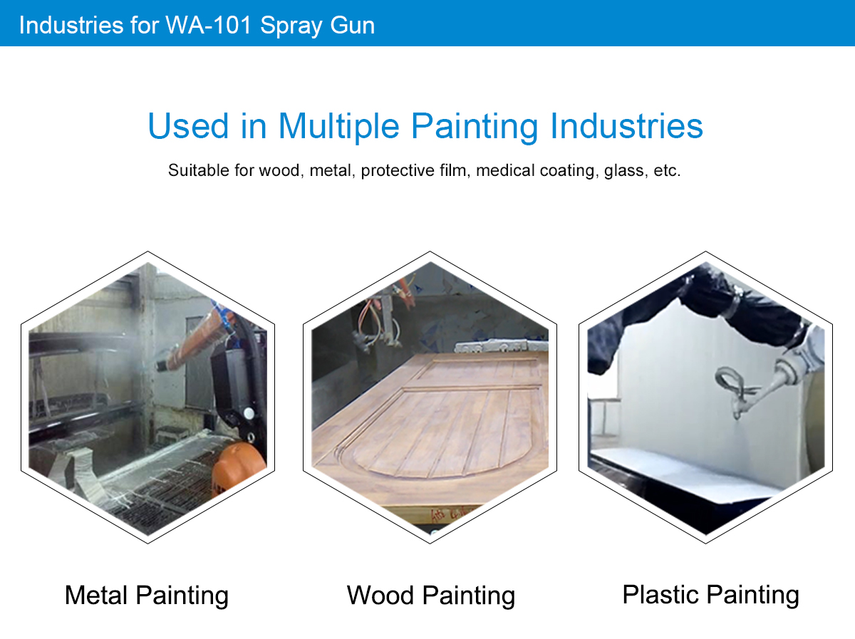 Air atomizes fluids and makes fluids come out from nozzle slowly, while high-speed airflow surrounds fluids. Fluids and air accelerate to rub together and then it makes fluids disperse to achieve atomization. Air spraying is able to achieve better painting quality, and it is called as car painting or A type painting.