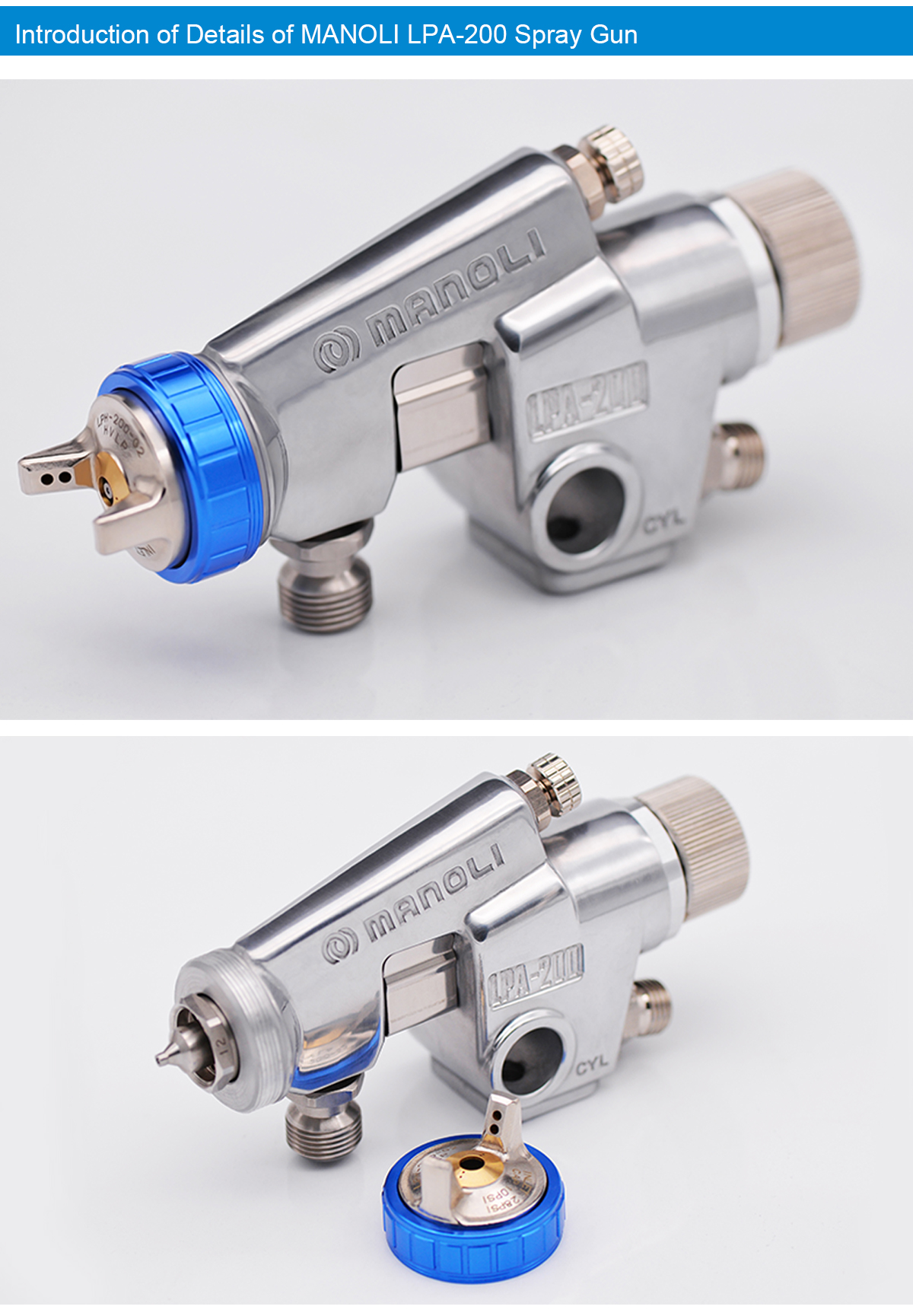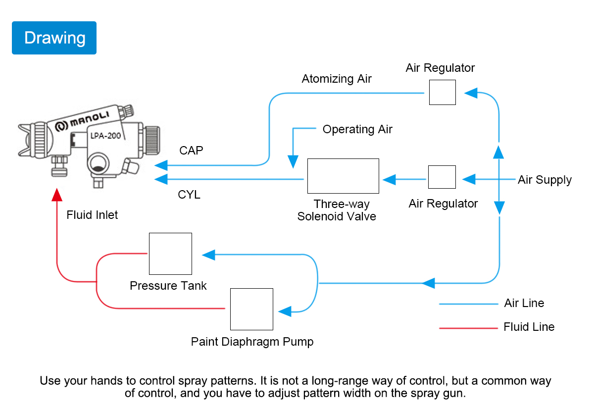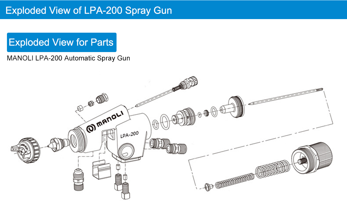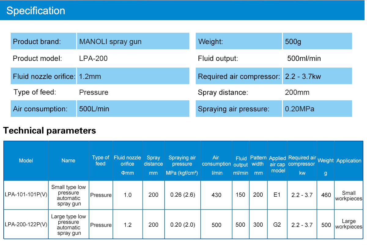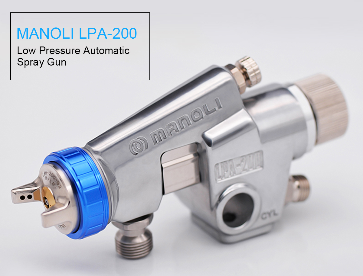 Advantage:Functions and features: The speed of air flow ejected from the low pressure spray gun is slower than that of a conventional spray gun, so there is less bounceback; With low spraying air pressure and less bounceback, paint particles easily reach the workpieces; The fluid nozzle and fluid needle are made of stainless steel for waterborne paint; Used with automatic painting equipment, reciprocators and painting robots for mass production; LPA-200 is a large type low pressure automatic spray gun, which is suitable for large workpieces.
