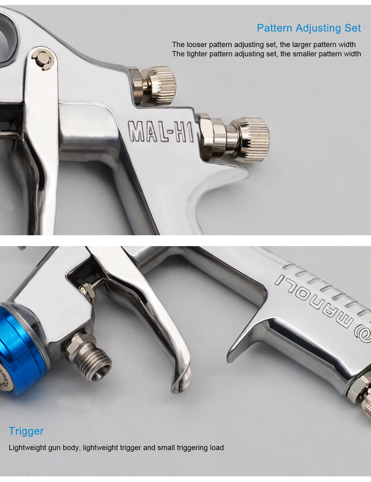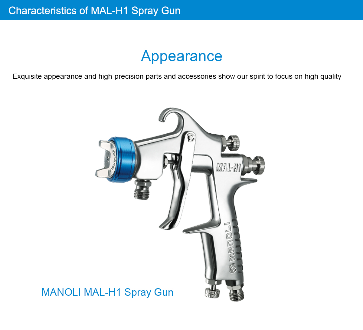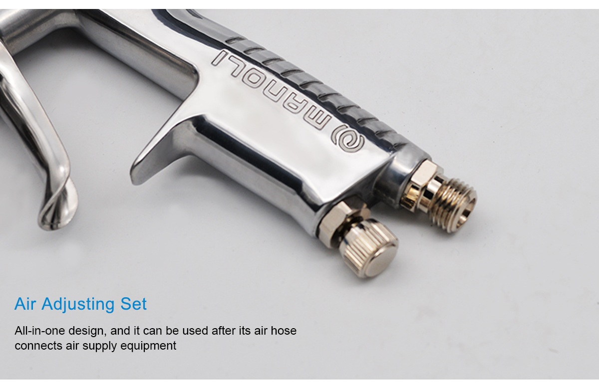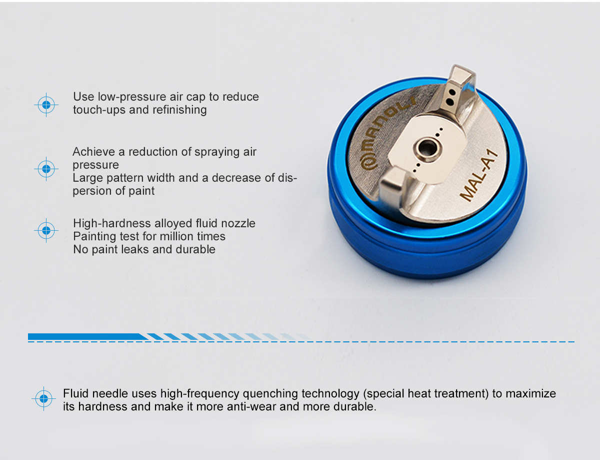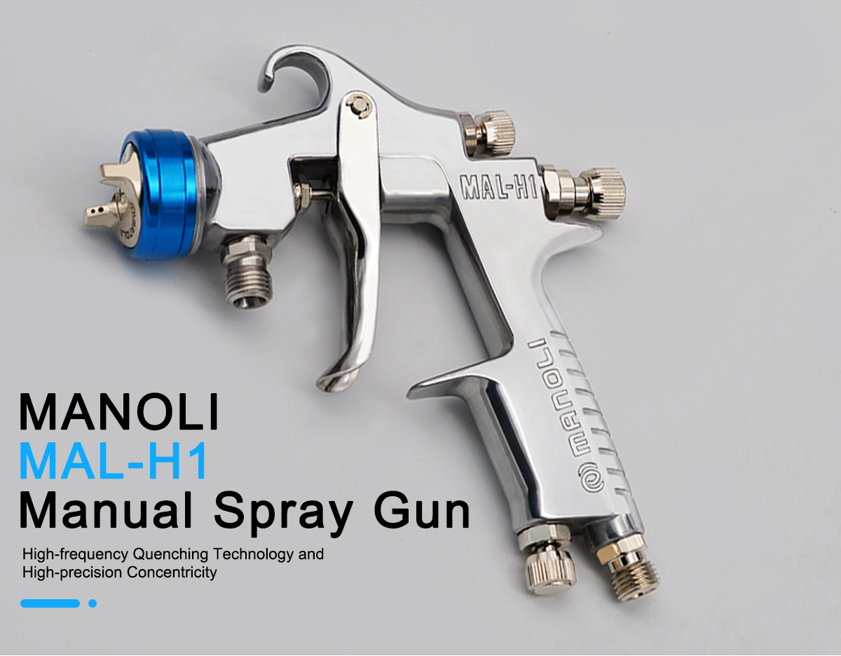 Characteristics of MAL-H1 Spray Gun Appearance Exquisite appearance and high-precision parts and accessories show our spirit to focus on high quality MANOLI MAL-H1 Spray Gun Use low-pressure air cap to reduce touch-ups and refinishing Achieve a reduction of spraying air pressure Large pattern width and a decrease of dispersion of paint High-hardness alloyed fluid nozzle Painting test for million times No paint leaks and durable