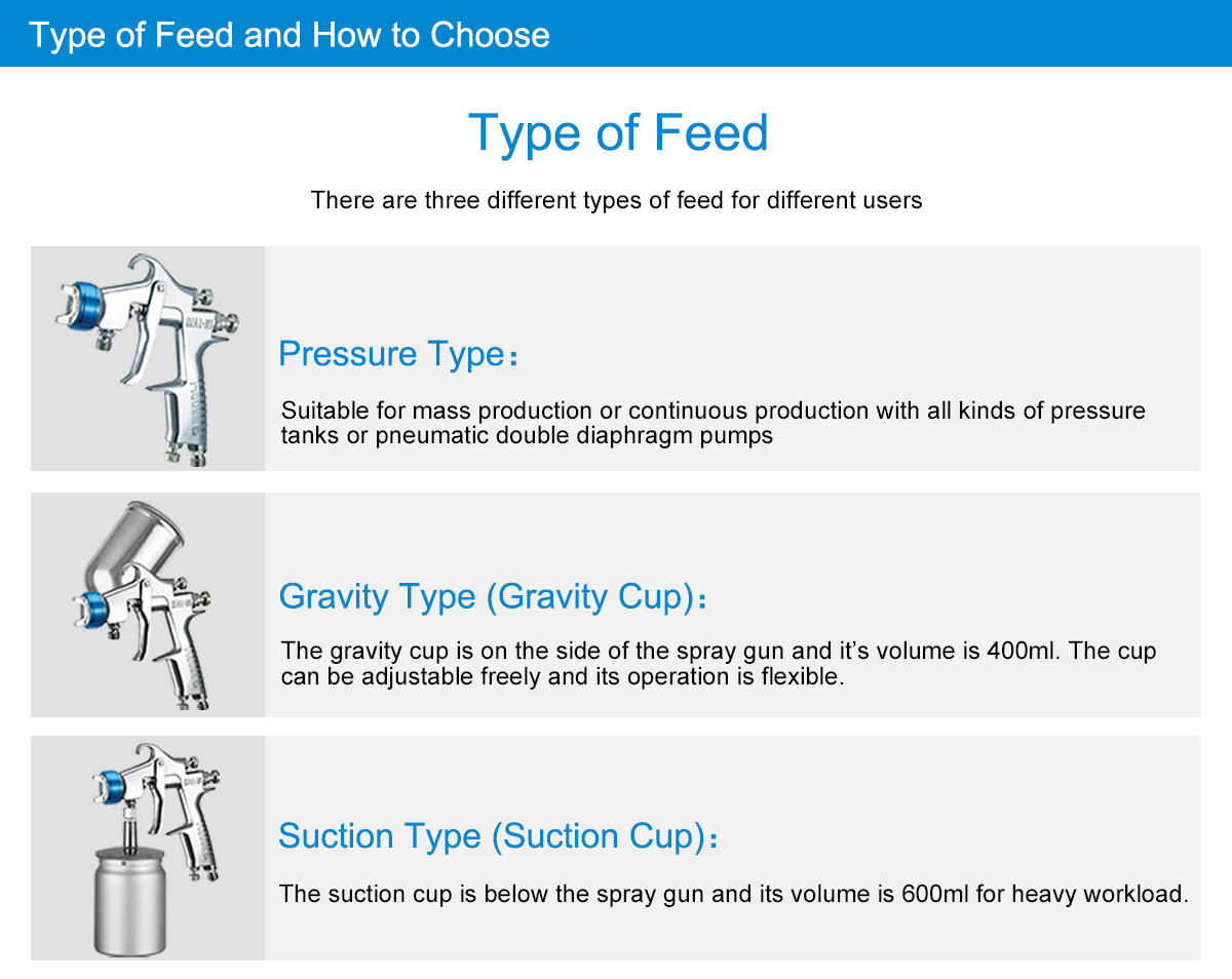 Type of Feed and How to Choose Type of Feed There are three different types of feed for different users Pressure Type Suitable for mass production or continuous production with all kinds of pressure tanks or pneumatic double diaphragm pumps Gravity Type (Gravity Cup) The gravity cup is on the side of the spray gun and it’s volume is 400ml. The cup can be adjustable freely and its operation is flexible. Suction Type (Suction Cup) The suction cup is below the spray gun and its volume is 600ml for heavy workload.